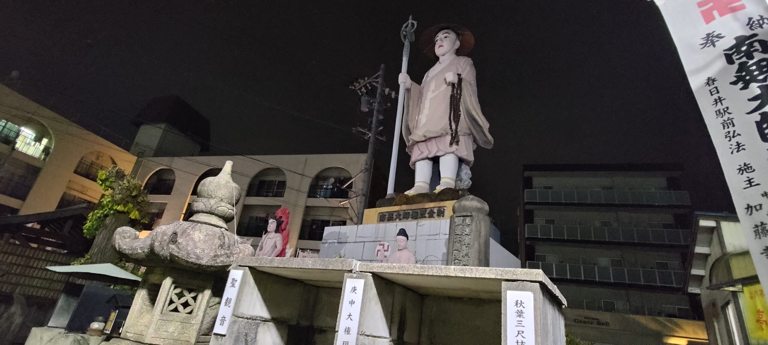 なんでも、春日井駅(当時は鳥居松駅)の駅前シンボルとして、1926年(昭和2年)に弘法大師像の建立が計画され、昭和7年に落慶法要が営まれたという歴史があるそうです。